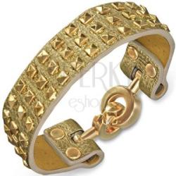 A bőrből készült karkötő felülete arany színű, tapintásra gumira emlékeztető anyaggal van bevonva. A pici arany színű piramisok három sorban vannak elhelyezve. A karkötő kapcsa két egymásba illeszthető karikából áll. Hosszúság: 195 mmSzélesség: 20 mm