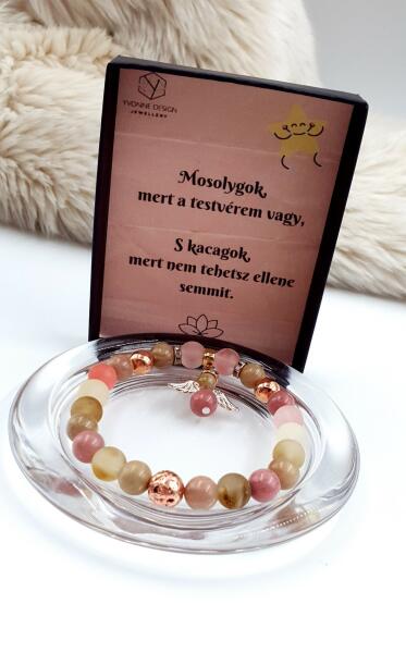 Testvér ajándék ásványkarkötő idézettel, megható ajándékkal kedveskednél testvérednek valami jeles esemény kapcsán, tökéletes választás ez a díszdobozos ásványkarkötő angyalka medállal és személyes üzenettel. A karkötő 8 mm -es rózsaopál, és rodonit ásványokból készült. Az ajándékszett része a karkötő, a díszdoboz, illetve a doboz belsejében található