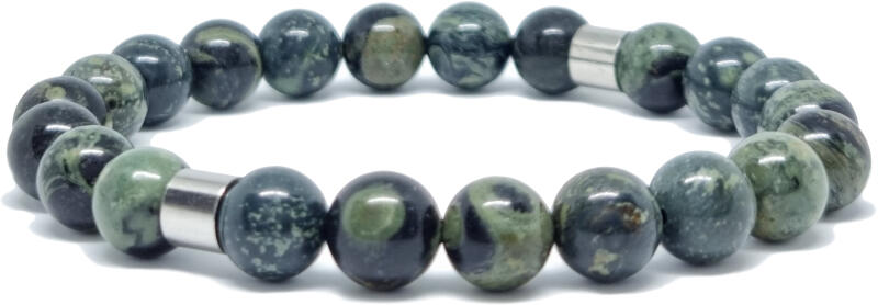 Kiváló minőségű valódi jáspis kambaba ásványból készült ásvány karkötő. A kambaba jáspis karkötő gazdag zöld és fekete színkombinációja és egyedi mintázata stílusos kiegészítőt kínál, miközben a bátorság és a stabilitás szimbólumaként is megjelenik. A karkötő valódi jáspis kambaba 8-9 mm ásványból és nemesacél cső köztes dísszel készült. Az ásv