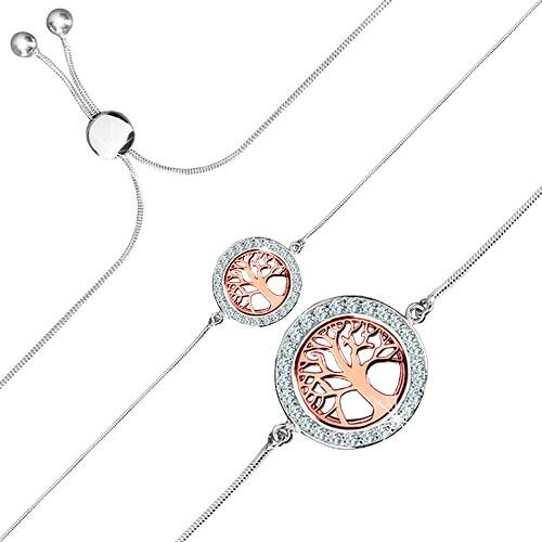 A 925 ezüst karkötő egy kígyómintás láncból és egy kerek medálból áll. A lapos kört egy metszett életfa díszíti, amely terebélyes lombkoronával rendelkezik. A fa felülete rózsa-arany színárnyalatú. A fát egy ezüst gyűrű veszi körül, amely átlátszó kerek cirkóniákkal van kirakva. A karkötő hossza a csúsztatható zár segítségével állítható. A díszes rész