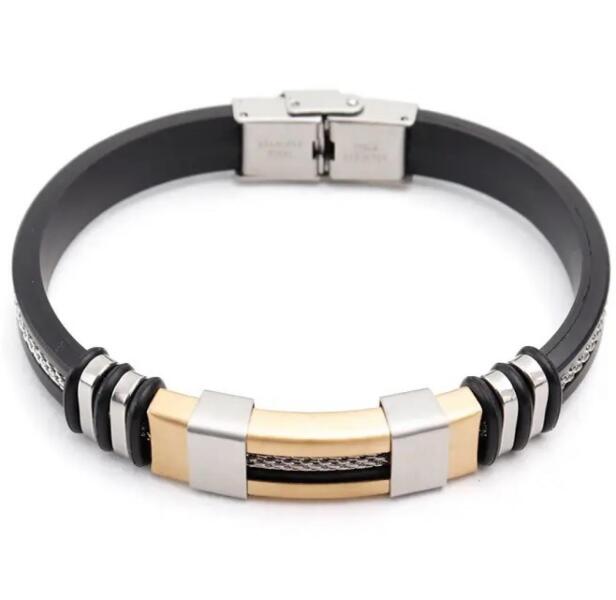 Alfonso Férfi Karkötő Különleges Alfonso karkötő uraknak verhetetlen áron. Ezzel a karkötővel szépen kiegészítheti öltözékét. Az ékszer nem tartalmaz sem nikkelt, sem ólmot, sem kadmiumot, ezért érzékeny bőrű emberek is viselhetik. Tulajdonságok: A karkötő hossza: 21cm Anyaga: Szilikon/Nemesacél Szín: Fekete/Ezüst/Arany