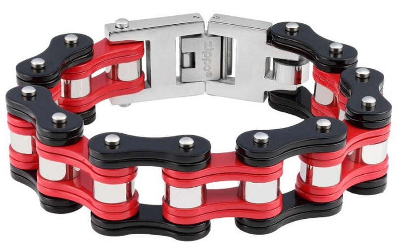 Zippo 2.006. 270 férfi karkötő. Motorkerékpár-lánc kialakításán alapuló karkötő polírozott Zippo név és a láng logóval. 65mm átmérő 18cm hosszú Nemesacél Fekete, piros és ezüst Ajándékdobozban csomagolva Három méretben kapható 18-20-22cm