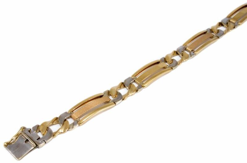 Modern stílusú, préselt mintával és ródiummal díszített, áttört stiftes férfi arany karlánc.