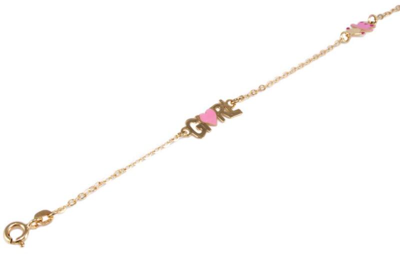 Modern stílusú, kedvelt fazonú, rózsaszín festéssel díszített, girl felirattal és kislánnyal díszített, anker arany gyerek karkötő.
