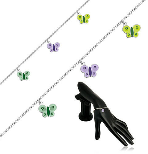 A 925 ezüst karkötőn három pillangó alakú medál függ, amelyeket lila és zöld fénymáz borít. A szárnyak vonalai és a hasuk fényes és ezüst színű. A pillangó szárnyait apró karikák díszítik, amelyek sötétlila és sötétzöld fénymázból vannak. A láncot egymásra merőlegesen összekapcsolt, kerek fényes szemek alkotják. Karkötő rugós karika kapoccsal. A díszes