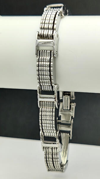 Ezüstszínű nemesacél (316L) karkötő. Tartós, minőségi ékszer, nem feketedik, nem kopik. Mindennapi viseletnek is tökéletes választás. Antiallergén ékszer. Hosszúság: 21 cm. Szélesség: 10 mm. A nemesacél ékszerek rendkívül népszerűek kedvező tulajdonságaik miatt. A nemesacél semmilyen nikkelsót nem bocsájt ki magából, ennek következtében teljesen allergiamentes, s