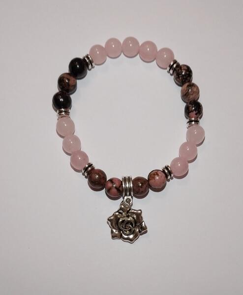 Rodonit és Rózsakvarc ásványból készült női karkötő rózsa medállal Gyöngyök mérete: 8 mm-es ásványgyöngyök Rugalmas, gumis ékszerdamil alapra készült A Rodonit a gyógyulás, a cselekvés és a megbocsátás köve. Segít megsemmisíteni akár az előző életekből származó érzelmi sebeket. Segít önmagunknak megbocsátani, támogatja az önbecsülést. Egyensúlyban tar
