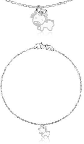 A 925 ezüst karkötő egy csillogó kicsi szemekből álló láncból áll, amelyek egymásra merőlegesen vannak összekapcsolva. A kis medál elejét fehér színű fénymáz díszíti. A tehén felismerhető részekkel rendelkezik - arc, fülek, szarvak, test és lábak. A medál hátulja fényes. Delfinkapocs. A díszes rész mérete: 10 x 10 mmA lánc szélessége: 1,1 mmA karkötő hossza: