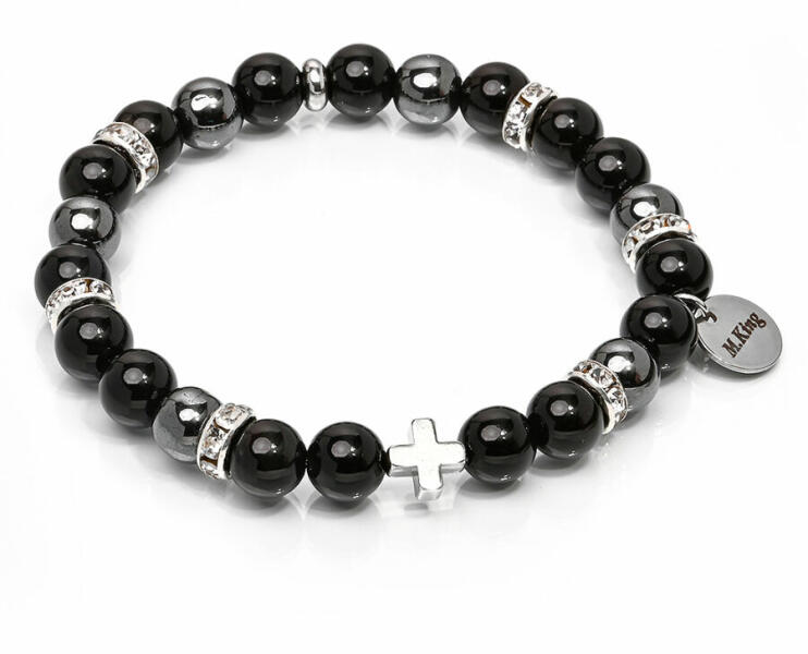 Letisztult, egyszerű ónix achát és hematit karkötő, egyértelmű üzenettel. Különleges fényű karkötő, plusz csillogással. HA KERESZT NÉLKÜL KÉRED, ÍRD BE RENDELÉSKOR A MEGJEGYZÉSBE! Fig yelem! A képen exkluzív kivitelű, rugalmas karkötő látható kapocs nélkül, de kérheted extra erős acélsodronyra is delfinkapoccsal és 5 cm hosszabbítólánccal. Ha a kapcsos verzió
