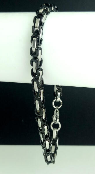 Fekete-ezüstszínű nemesacél (316L) királylánc karkötő. Tartós, minőségi ékszer, nem feketedik, nem színezi a bőrt. Mindennapi viseletnek is tökéletes választás. Antiallergén ékszer. Hosszúság: 22 cm. Szélesség: 5 mm. Igény esetén rövidíthető, melyet ingyenesen elvégzünk. Kérjük a méretet rendeléskor a megjegyzés rovatban feltüntetni. A nemesacél ékszerek rend