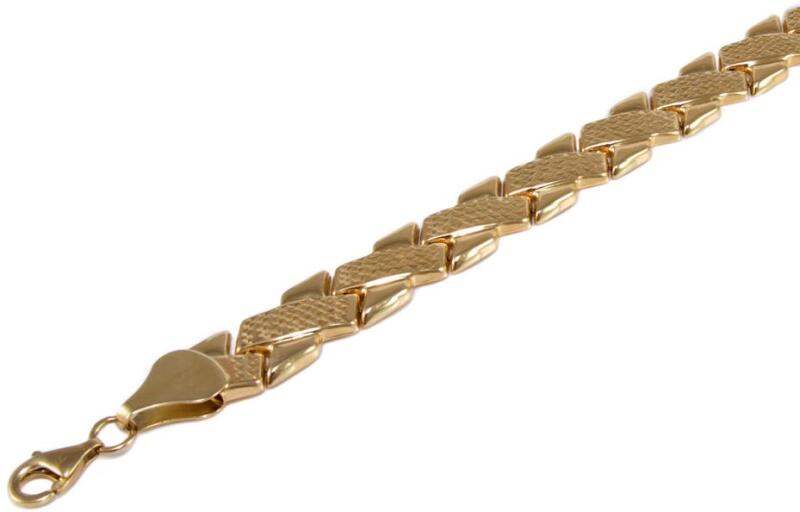 Modern stílusú, "x" mintás, csillogó véséssel díszített, üreges, de masszív szemekből készült stiftes arany karkötő.