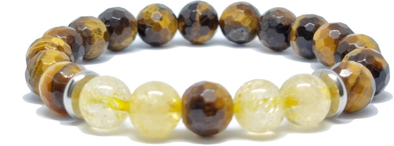 Kiváló minőségű valódi tigrisszem fazettált ásványból készült ásvány karkötő. A tigrisszem fazettált karkötő aranybarna fényjátéka és jellegzetes mintázata erőt sugároz, miközben a bátorság és a fókuszált figyelem szimbólumaként viselhető. A karkötő valódi tigrisszem fazettált, citrin 8-9 mm ásványból és nemesacél köztes dísszel készült. Az ásvá