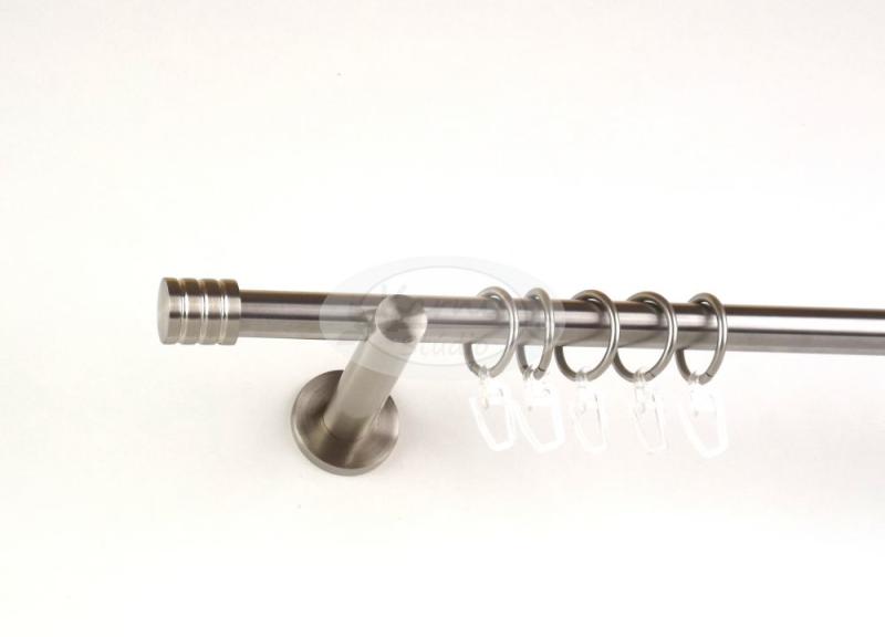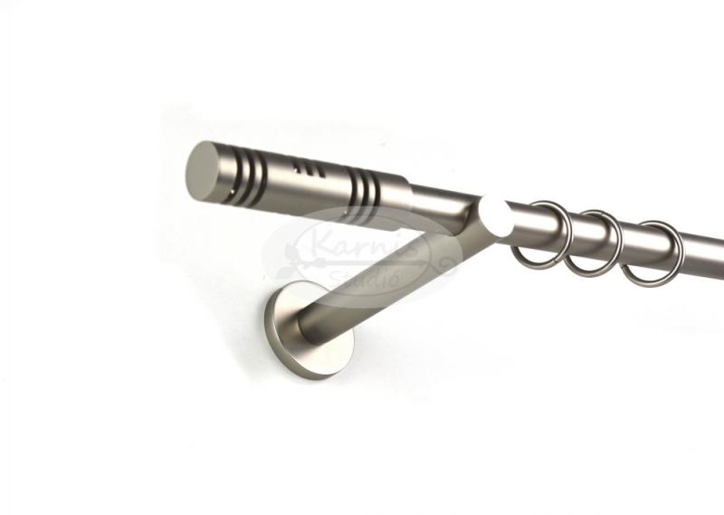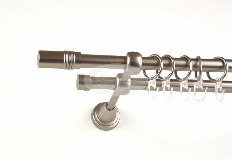 A CHICAGO 300 cm-es nikkel-matt színű 2 rudas fém karnis szett tartalma: 2 db 300 cm-es nikkel-matt színű 16 mm átmérőjű fém karnisrúd 2 db Chicago típusú nikkel-matt színű fém karnis végzáró 2 db Kansas típusú, kis kupak formájú fém karnis végzáró 3 db falra szerelhető, modern fém konzol 60 db fém karika műanyag ráncszedő kampóval