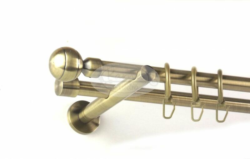 A SZEGED óarany színű, 200 cm-es, 2 rudas, modern tartós fém karnis szett tartalma: 2 db 200 cm-es óarany fém karnisrúd 2 db Szeged típusú óarany színű fém végzáró 2 db Veszprém típusú kis gömb végzáró 2 db falra szerelhető modern fém konzol 40 db óarany színű műanyag karika ráncszedő kampóval