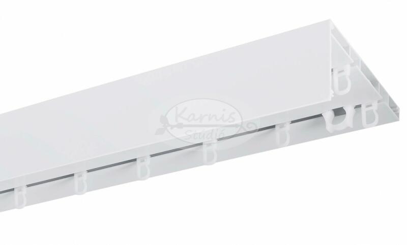 PRIMUS fehér színű 2 sínes előlapos alumínium sín csúszkákkal és végzárókkal. Előlapja nem levehető, 65 mm magas. A sín szélessége: 120 mm. A két sínpálya egymástól való távolsága 5 cm. Csak mennyezetre szerelhető! Max. 15 kg teherbírású (méterenként). Széles előlapja és nagy teherbírása miatt bátran ajánljuk nagy méretű ablakokhoz, földig érő függöny