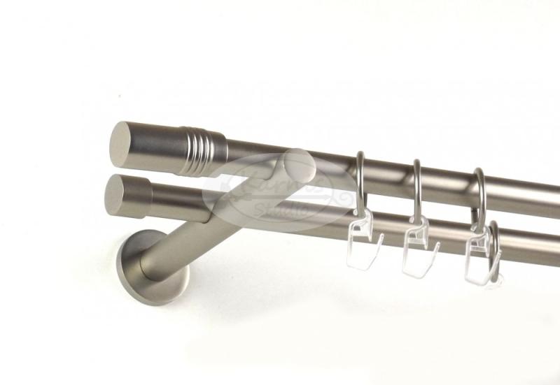 A NIZZA 2 rudas, 160 cm-es TITÁN színű fém karnis szett tartalma: 2 db 19 mm átmérőjű, 160 cm hosszú fém karnisrúd titán színben 2 db Nizza típusú fém karnis végzáró 2 db Nantes típusú fém karnis végzáró 2 db falra szerelhető fém konzol 32 db titán színű fém karika ráncszedő kampóval A Karnis Stúdió által kínált függönykarnis rudak fix méretűek, de egysze