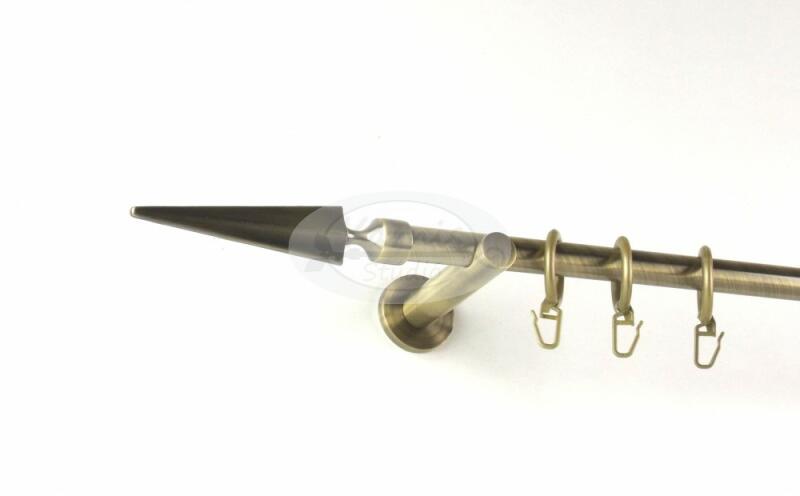 A KESZTHELY óarany színű, 200 cm-es, 1 rudas, modern tartós fém karnis szett tartalma: 1 db 200 cm-es óarany színű, 16 mm átmérőjű fém karnisrúd 2 db Keszthely típusú óarany színű fém karnis végzáró 2 db falra szerelhető modern fém konzol 20 db óarany színű műanyag függönykarika ráncszedő kampóval