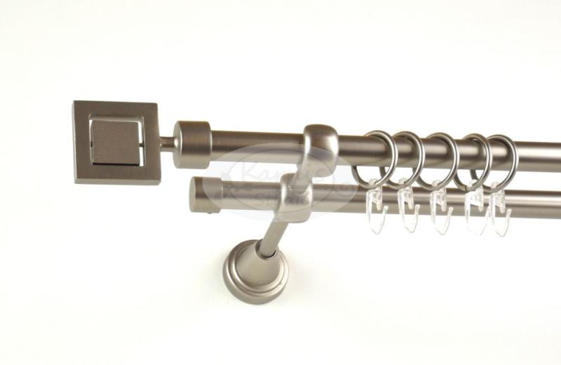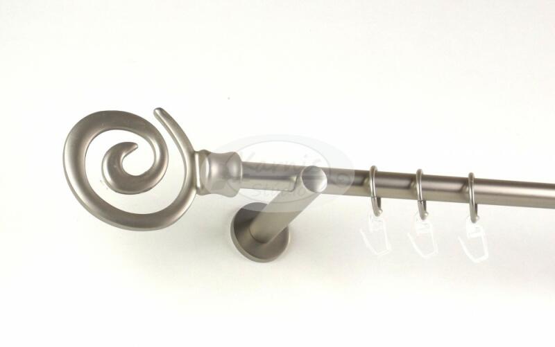 A SZELLŐ 240 cm-es nikkel-matt színű 2 rudas fém karnis szett tartalma: 2 db 240 cm-es nikkel-matt színű 16 mm átmérőjű fém karnisrúd 2 db Szellő típusú nikkel-matt színű fém karnis végzáró 2 db Veszprém típusú, kis gömb formájú fém karnis végzáró 3 db falra szerelhető, modern fém konzol 48 db fém karika műanyag ráncszedő kampóval