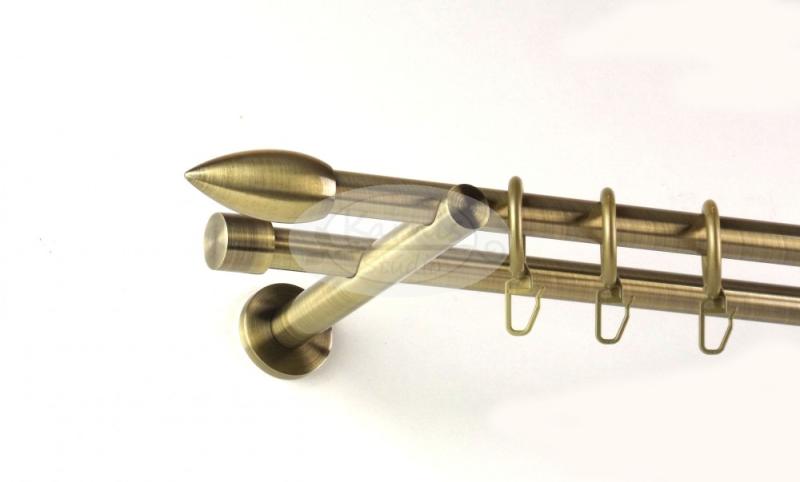 Óarany (antik arany, réz-antik) színű fémből készült hajlított tartó konzol 16 mm átmérőjű 2 rudas karnishoz. A faltáv kb. 15,5 cm. 1 db / csomag A csomag tartalmazza a felszereléshez szükséges tipliket és csavarokat is, valamint a karisrudat rögzítő kisebb csavarokat is, amelyek megakadályozzák, hogy a karnisrúd - a függöny elhúzásakor - elmozduljon. Ez a típusú kar