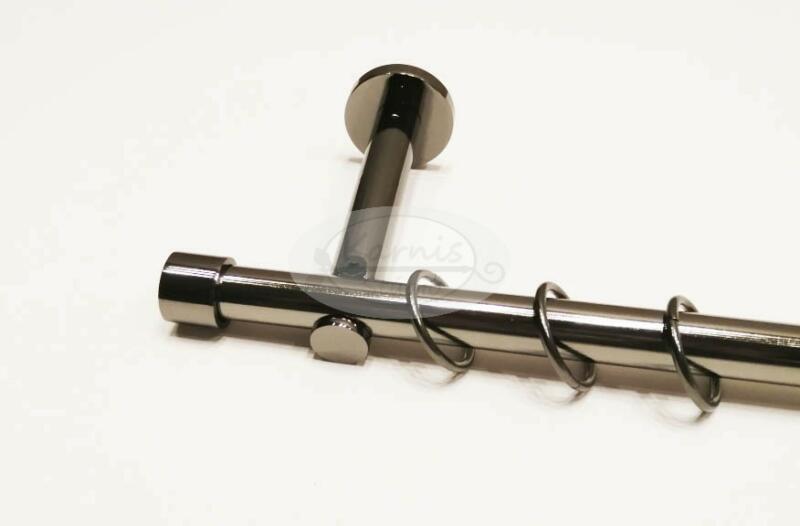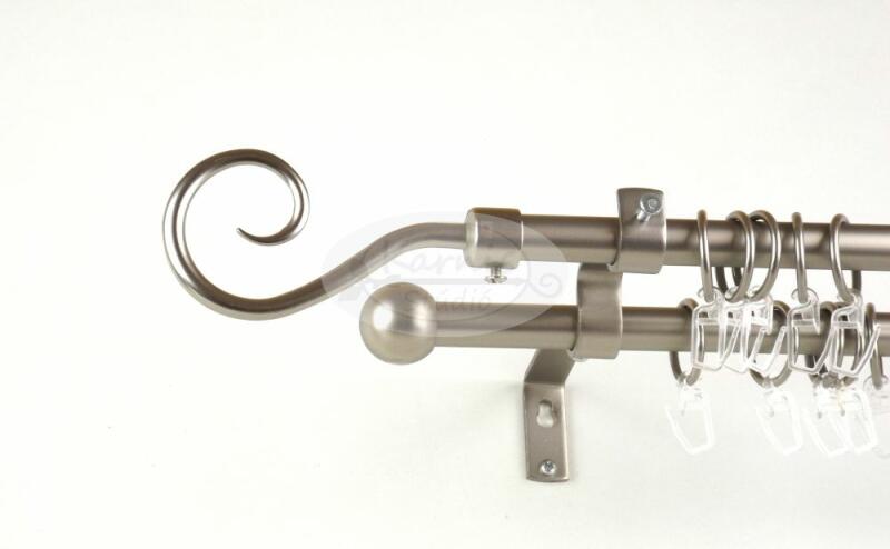A MIAMI 300 cm-es nikkel-matt színű 2 rudas fém karnis szett tartalma: 2 db 300 cm-es nikkel-matt színű 16 mm átmérőjű fém karnisrúd 2 db Miami típusú nikkel-matt színű fém karnis végzáró 2 db Kansas típusú, kis kupak formájú fém karnis végzáró 3 db falra szerelhető, modern fém konzol 60 db fém karika műanyag ráncszedő kampóval