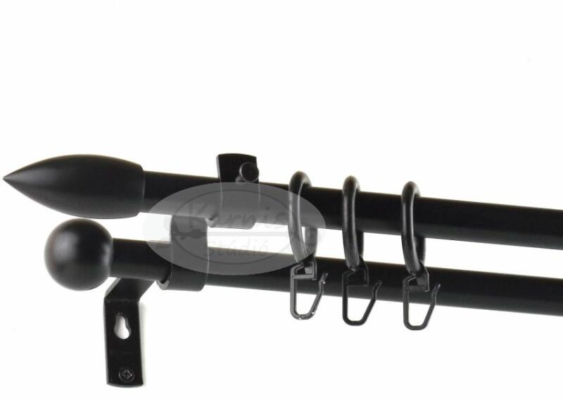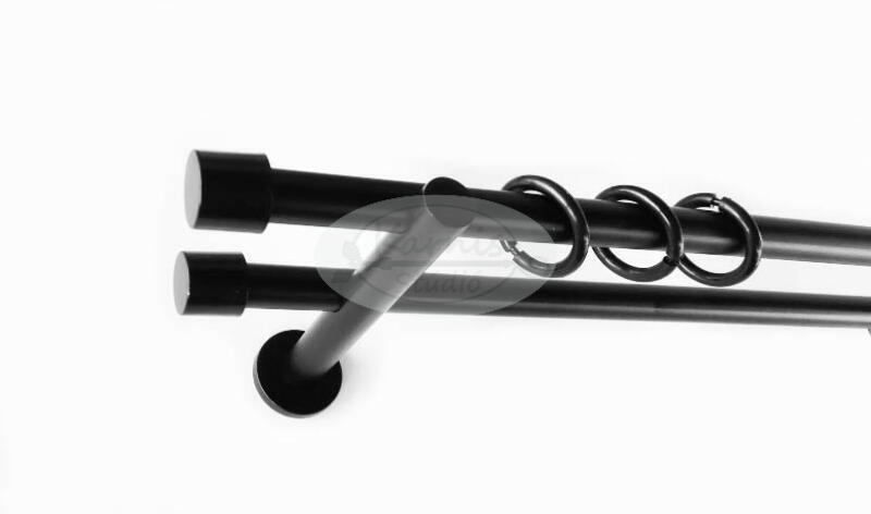 A VILLÁNY fekete 300 cm-es, 2 rudas, modern tartós fém karnis szett tartalma: 2 db 300 cm-es fekete színű, 16 mm átmérőjű fém karnisrúd 4 db Villány típusú kis kupak végzáró 3 db falra szerelhető fém konzol 60 db fekete műanyag függönykarika ráncszedő kampóval