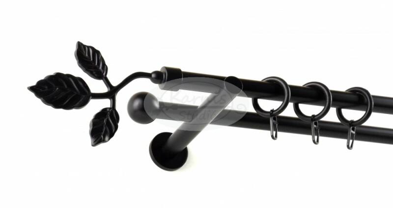 A TATA fekete 320 cm-es, 2 rudas, modern tartós fém karnis szett tartalma: 4 db 160 cm-es fekete színű, 16 mm átmérőjű fém karnisrúd 2 db toldó elem 2 db Tata típusú fekete fém végzáró 2 db Veszprém típusú kis gömb végzáró 3 db falra szerelhető fém konzol 64 db fekete műanyag függönykarika ráncszedő kampóval