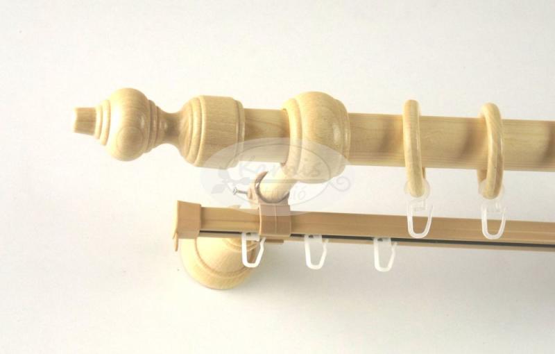 A 120 cm-es, U-sínes natúr színű fa karnis szett tartalma: 1 db 120 cm-es, 28 mm átmérőjű, natúr színű fa karnis rúd 2 db fa karnis végzáró a rúd végeire 2 db fa tartókonzol (zárt típusú) 12 db natúr színű fa függönykarika műanyag ráncszedő kampóval 1 db 110 cm-es alumínium u-sín bézs színben (a hozzá való műanyag tartókkal, végzárókkal és görgős kampók