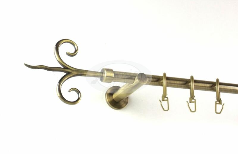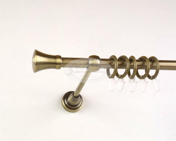 A KECSKEMÉT óarany színű, 320 cm-es, 1 rudas, modern tartós fém karnis szett tartalma: 2 db 160 cm-es óarany színű, 16 mm átmérőjű fém karnisrúd 1 db toldó elem 2 db Kecskemét típusú óarany színű fém karnis végzáró 3 db falra szerelhető modern fém konzol 32 db óarany színű műanyag függönykarika ráncszedő kampóval