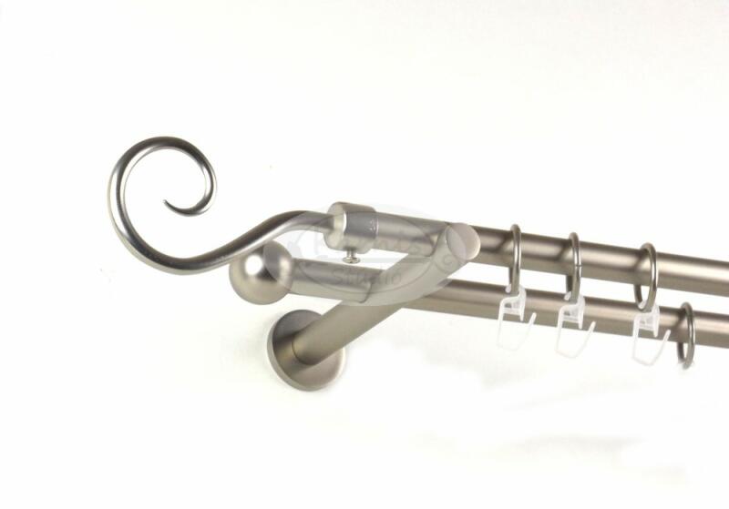 A SOPRON 200 cm-es nikkel-matt színű 2 rudas fém karnis szett tartalma: 2 db 200 cm-es nikkel-matt színű 16 mm átmérőjű fém karnisrúd 2 db Sopron típusú nikkel-matt színű fém karnis végzáró 2 db Veszprém típusú, kis gömb formájú fém karnis végzáró 2 db falra szerelhető, modern fém konzol 40 db fém karika műanyag ráncszedő kampóval