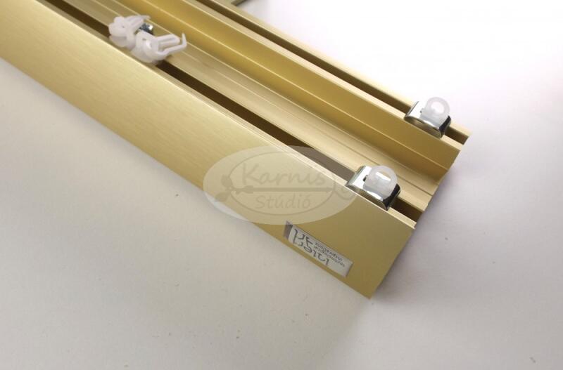 Pezsgő színű, alumínium alapanyagú jó minőségű, erős két pályás függönysín több méretben. A szett tartalma: - pezsgő színű alumínium profil 4 cm magas előlappal a kiválasztott hosszúságban - 1 pár végzáró, mely eltakarja a sín keresztmetszetét (15 cm hosszú, de rövidíthető ugyanakkora méretre mint a sín szélessége) - 2 pár végrögzítő (stop csúszka), am