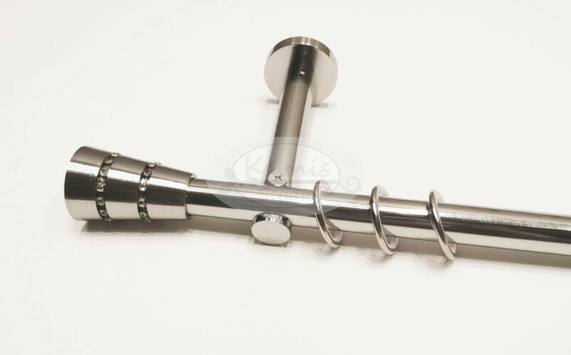 A PROVINS 1 rudas, 200 cm-es fém karnis szett tartalma: 1 db 19 mm átmérőjű, 200 cm hosszú fém karnisrúd (fényes inox színben) 2 db Provins típusú, strasszkövekkel díszített fém karnis végzáró 2 db falra szerelhető fém konzol 20 db szilikon betétes fém karika (ún. csöndesgyűrű) ráncszedő kampóval A 19 mm-es France Prémium függönykarnis család tagjai - ahogyan erre