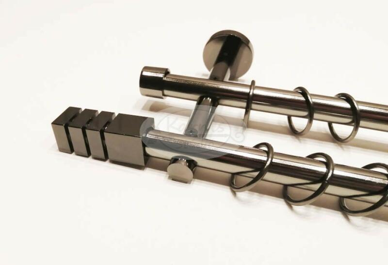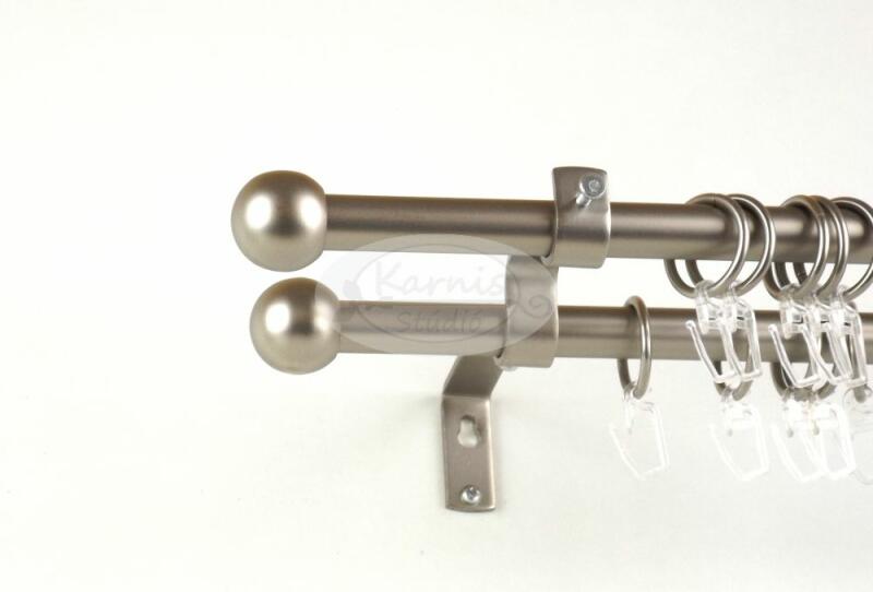 A NIZZA 2 rudas, 300 cm-es TITÁN színű fém karnis szett tartalma: 2 db 19 mm átmérőjű, 300 cm hosszú fém karnisrúd titán színben 2 db Nizza típusú fém karnis végzáró 2 db Nantes típusú fém karnis végzáró 3 db falra szerelhető fém konzol 60 db titán színű fém karika ráncszedő kampóval A Karnis Stúdió által kínált függönykarnis rudak fix méretűek, de egysze