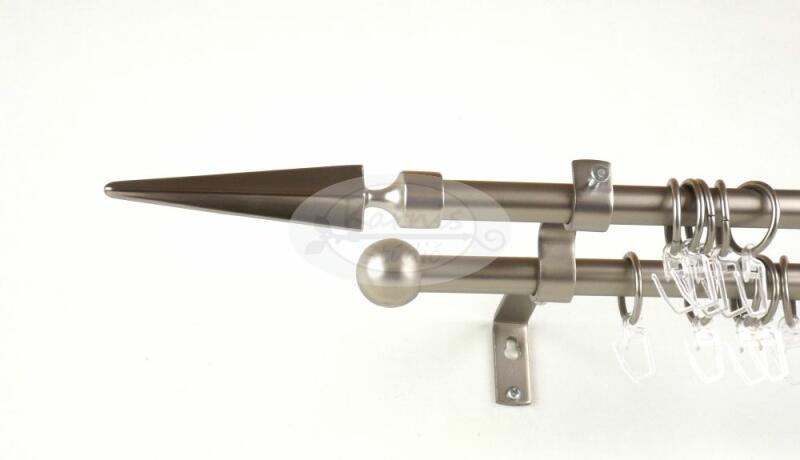 A KESZTHELY nikkel-matt színű 300 cm-es 2 rudas fém karnis szett tartalma: 2 db nikkel-matt színű 300 cm-es fém karnisrúd 2 db Keszthely típusú nikkel-matt színű végzáró 2 db Veszprém típusú kis gömb végzáró 3 db falra szerelhető fém konzol 60 db fém karika műanyag ráncszedő kampóval a felszereléshez szükséges tiplik és csavarok
