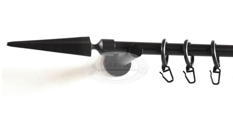 A SZELLŐ fekete 1 rudas, 200 cm-es, modern tartós fém karnis szett tartalma: 1 db fekete színű, 200 cm hosszú, 16 mm átmérőjű fém karnisrúd 2 db Szellő típusú fekete fém végzáró 2 db falra szerelhető modern fém konzol 20 db fekete műanyag karika fekete színű ráncszedő kampóval