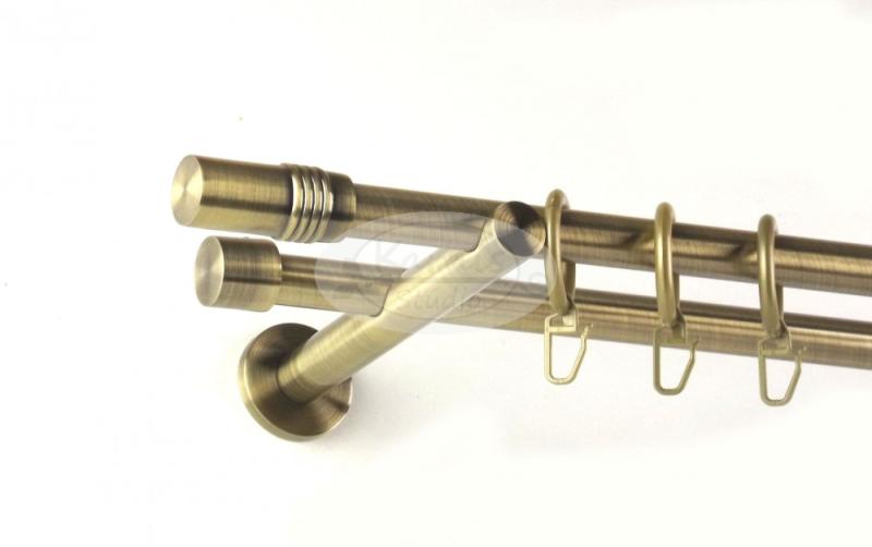 A HOUSTON óarany színű, 300 cm-es, 2 rudas, fém karnis szett tartalma: 2 db 300 cm-es óarany fém karnisrúd 2 db Houston típusú óarany színű fém végzáró 2 db Kansas típusú kis kupak végzáró 3 db falra szerelhető fém konzol 60 db óarany színű műanyag karika ráncszedő kampóval