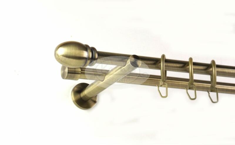 A SZEGED óarany színű, 300 cm-es, 2 rudas, modern tartós fém karnis szett tartalma: 2 db 300 cm-es óarany fém karnisrúd 2 db Szeged típusú óarany színű fém végzáró 2 db Veszprém típusú kis gömb végzáró 3 db falra szerelhető modern fém konzol 60 db óarany színű műanyag karika ráncszedő kampóval