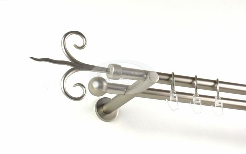 A KECSKEMÉT 200 cm-es nikkel-matt színű 2 rudas fém karnis szett tartalma: 2 db 200 cm-es nikkel-matt színű 16 mm átmérőjű fém karnisrúd 2 db Kecskemét típusú nikkel-matt színű fém karnis végzáró 2 db Veszprém típusú, kis gömb formájú fém karnis végzáró 2 db falra szerelhető, modern fém konzol 40 db fém karika műanyag ráncszedő kampóval