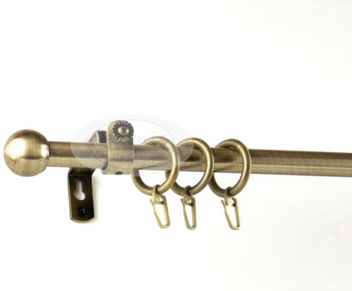 A 160 cm-es VESZPRÉM óarany színű 1 rudas fém karnis szett tartalma: 1 db 160 cm-e óarany fém karnisrúd 2 db Veszprém típusú óarany színű fém végzáró 2 db falra szerelhető fém konzol 16 db óarany színű műanyag karika ráncszedő kampóval
