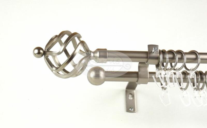 A SZEGED nikkel-matt színű 240 cm-es 2 rudas karnis szett tartalma: 2 db 240 cm-es nikkel-matt színű, 16 mm átmérőjű fém karnisrúd 2 db Szeged típusú nikkel-matt színű végzáró 2 db Veszprém típusú kis gömb végzáró 3 db falra szerelhető fém konzol 48 db fém függönykarika műanyag ráncszedő kampóval a felszereléshez szükséges tiplik és csavarok