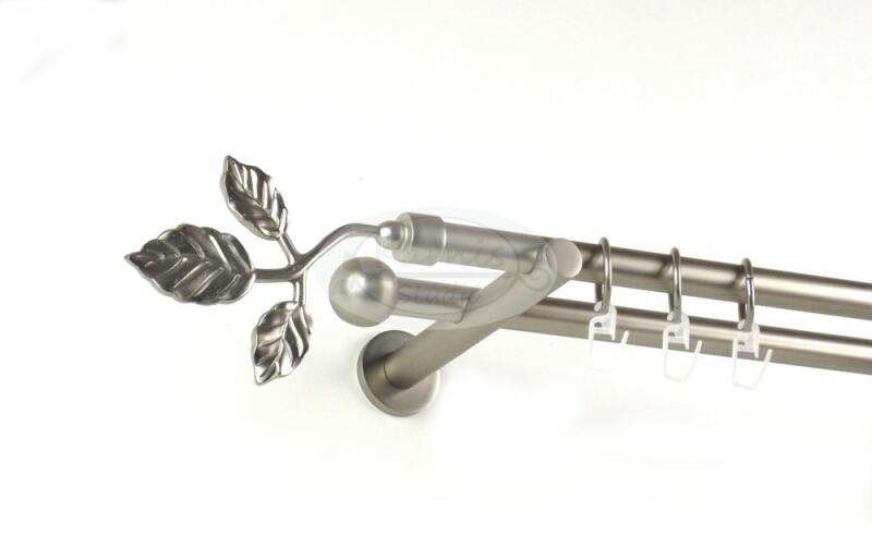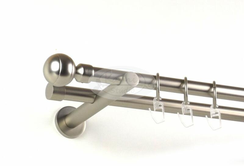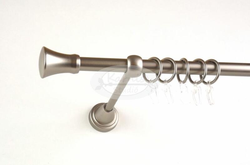 A LOS ANGELES 300 cm-es nikkel-matt színű 2 rudas fém karnis szett tartalma: 2 db 300 cm-es nikkel-matt színű 16 mm átmérőjű fém karnisrúd 2 db Los Angeles típusú nikkel-matt színű fém karnis végzáró 2 db Kansas típusú, kis kupak formájú fém karnis végzáró 3 db falra szerelhető, modern fém konzol 60 db fém karika műanyag ráncszedő kampóval