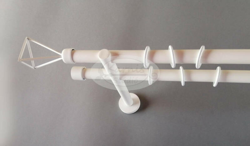 A REIMS 2 rudas, 320 cm-es FEHÉR színű fém karnis szett tartalma: 4 db 19 mm átmérőjű, 160 cm hosszú fém karnisrúd fehér színben 2 db toldó elem 2 db Reims típusú fém karnis végzáró 2 db Nantes típusú fém karnis végzáró 3 db falra szerelhető fém konzol 64 db szilikon betétes fehér színű fém függönykarika ráncszedő kampóval A 19 mm-es France függönykarnis csa