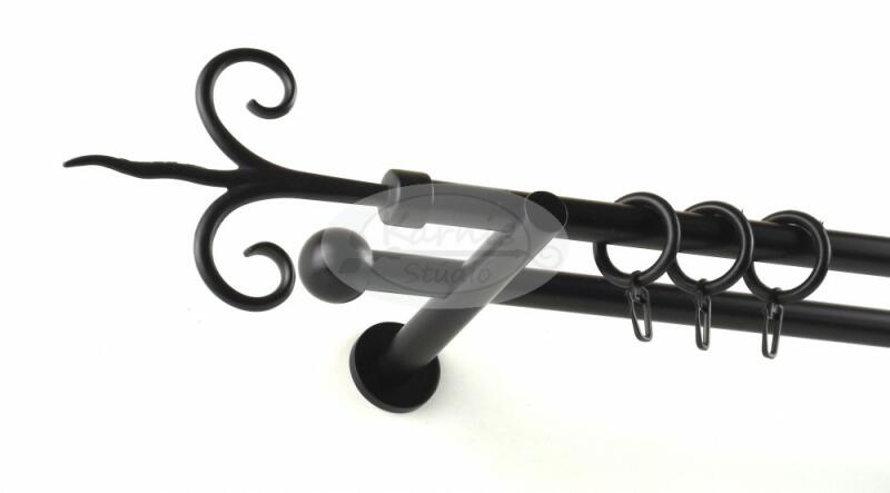 A KECSKEMÉT fekete 200 cm-es, 2 rudas, modern tartós fém karnis szett tartalma: 2 db 200 cm-es fekete színű, 16 mm átmérőjű fém karnisrúd 2 db Kecskemét típusú fekete fém végzáró 2 db Veszprém típusú kis gömb végzáró 2 db falra szerelhető fém konzol 40 db fekete műanyag függönykarika ráncszedő kampóval