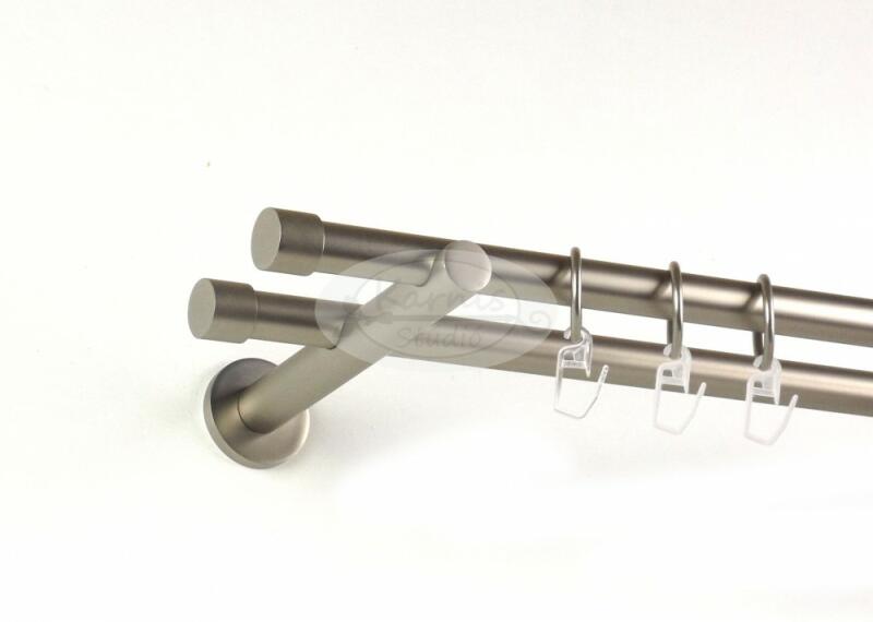 A KANSAS 160 cm-es nikkel-matt színű 2 rudas fém karnis szett tartalma: 2 db 160 cm-es nikkel-matt színű 16 mm átmérőjű fém karnisrúd 4 db Kansas típusú, kis kupak formájú fém karnis végzáró 2 db falra szerelhető, modern fém konzol 32 db fém karika műanyag ráncszedő kampóval