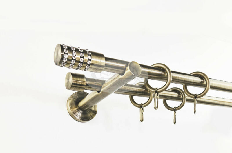 A BALTIMORE óarany színű, 320 cm-es, 2 rudas, modern tartós fém karnis szett tartalma: 4 db 160 cm-es, óarany színű, 16 mm átmérőjű fém karnisrúd 2 db toldó elem 2 db Baltimore strasszkövekkel díszített óarany színű fém karnis végzáró 2 db Kansas típusú (kis kupak formájú) óarany színű fém karnis végzáró 3 db falra szerelhető modern fém konzol 64 db óarany sz