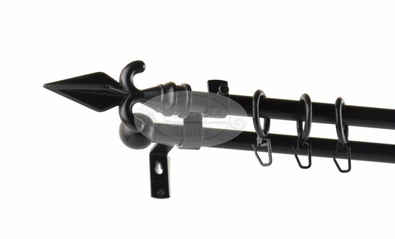 FIGYELEM! KIFUTÓ TERMÉK! ALACSONY KÉSZLET! A SZOLNOK fekete 300 cm-es 2 rudas karnis szett tartalma: 2 db fekete 300 cm-es fém karnisrúd a választott hosszúságban 2 db Szolnok típusú fekete fém végzáró 2 db Veszprém típusú kis gömb végzáró 3 db falra szerelhető fém konzol a felszereléshez szükséges tiplik és csavarok 60 db fekete műanyag függönykarika ráncszedő kamp