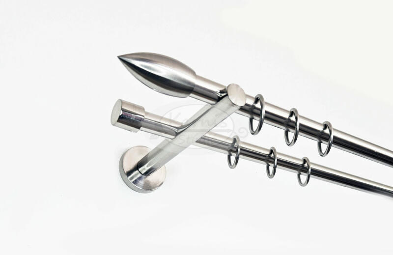 Az AMSTERDAM 2 rudas, 160 cm-es, inox színű fém karnis szett tartalma: 2 db 160 cm-e fényes inox színű fém karnisrúd 2 db Amsterdam fém karnis végzáró 2 db Varsó (kis kupak formájú) fém karnis végzáró 2 db falra szerelhető fém konzol 32 db fém függönykarika műanyag ráncszedő kampóval