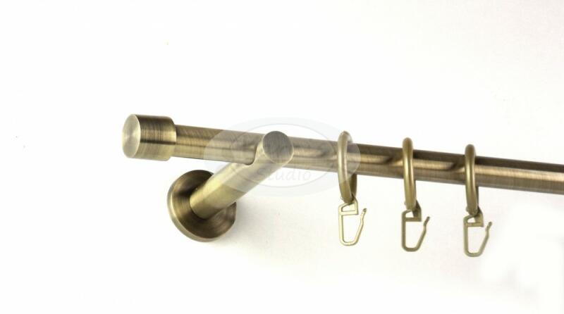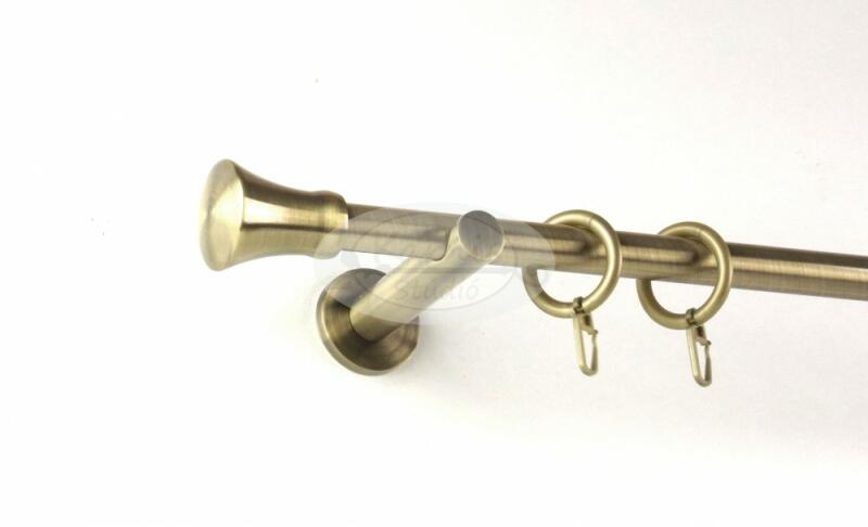 A KESZTHELY óarany színű, 300 cm-es, 1 rudas, modern tartós fém karnis szett tartalma: 1 db 300 cm-es óarany színű, 16 mm átmérőjű fém karnisrúd 2 db Keszthely típusú óarany színű fém karnis végzáró 3 db falra szerelhető modern fém konzol 30 db óarany színű műanyag függönykarika ráncszedő kampóval