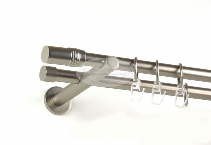 A BOSTON 300 cm-es nikkel-matt színű 2 rudas fém karnis szett tartalma: 2 db 300 cm-es nikkel-matt színű 16 mm átmérőjű fém karnisrúd 2 db Boston típusú nikkel-matt színű fém karnis végzáró 2 db Kansas típusú, kis kupak formájú fém karnis végzáró 3 db falra szerelhető, modern fém konzol 60 db fém karika műanyag ráncszedő kampóval
