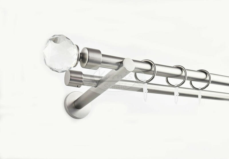 A LAS VEGAS 200 cm-es nikkel-matt színű 2 rudas fém karnis szett tartalma: 2 db 200 cm-es nikkel-matt színű 16 mm átmérőjű fém karnisrúd 2 db Las Vegas típusú, "kristály gömb" fém karnis végzáró 2 db Kansas típusú, kis kupak formájú fém karnis végzáró 2 db falra szerelhető, modern fém konzol 40 db fém karika műanyag ráncszedő kampóval