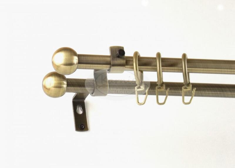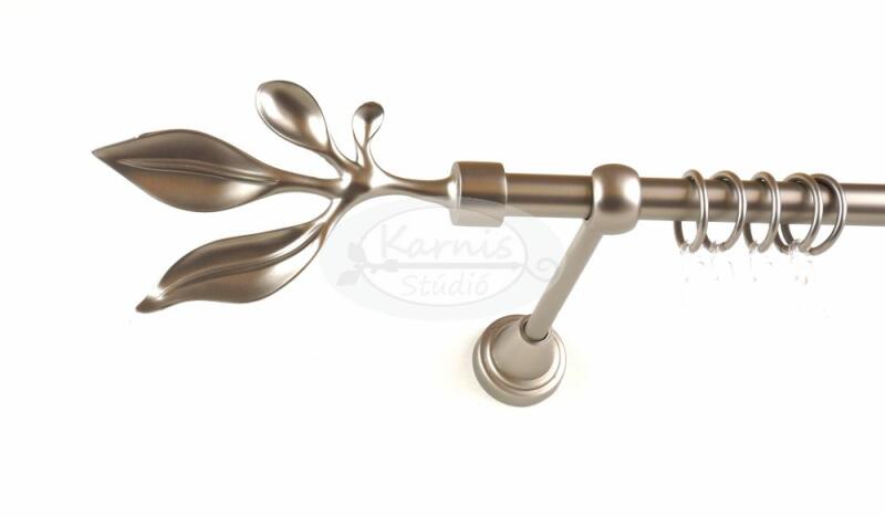 A VESZPRÉM 320 cm-es óarany színű 2 rudas fém karnis szett tartalma: 4 db 160 cm-es óarany színű, 16 mm átmérőjű fém karnisrúd 2 db toldó elem 4 db Veszprém típusú óarany színű fém végzáró 2 db falra szerelhető fém konzol 64 db óarany színű műanyag karika ráncszedő kampóval